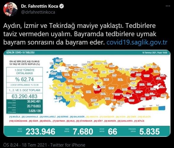 Tüm dünyada etkisini gösteren ve ülkemizde de 50 binden fazla kişinin hayatını kaybetmesine neden olan Korona virüs ile mücadele sürüyor. Başlatılan aşılama çalışmaları hızla ilerlerken, Sağlık Bakanı Fahrettin Koca yaptığı paylaşımla Aydınlılara müjdeli haberi verdi. Bakan Koca, Aydın'ın yüzde 75'inin aşılandığını ve risk haritasında düşük risk grubunu gösteren mavi renge yaklaştığını kaydetti. Kurban Bayramı öncesinde vatandaşları bayramda tedbirlere taviz vermeden uymaya davet eden Bakan Koca paylaşımında şu ifadelere yer verdi: "Aydın, İzmir ve Tekirdağ maviye yaklaştı. Tedbirlere taviz vermeden uyalım. Bayramda tedbirlere uymak bayram sonrasını da bayram eder."