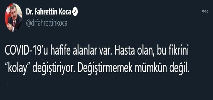 Sağlık Bakanı Fahrettin Koca Twitter hesabından gün içerisinde uyarılarda bulunmaya devam etti. Bakan Koca daha önceki paylaşımlarında havaların soğuduğuna ve maske kullanımının daha da önemli hale geldiğine dikkat çeken paylaşımlar yaptı. Son yaptığı paylaşımda ise, "Covid-19'u hafife alanlar var. Hasta olan, bu fikrini 'kolay' değiştiriyor. Değiştirmemek mümkün değil" ifadelerini kullandı.