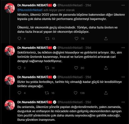 Bakan Nebati, Twitter'daki hesabından 'Türkiye Ekonomi Modeli'ne ilişkin açıklamalarda bulundu. Nebati, model ile döviz kurlarında zaman zaman yaşanan hareketliliğin etki alanının zayıfladığını belirterek, "Ülkemiz, Türkiye Ekonomi Modeli çerçevesinde, katma değerli üretim anlayışını benimseyerek ihracatı teşvik etmekte ve bu yolda kararlılıkla ilerlemektedir. Bu model ile döviz kurlarında zaman zaman yaşanan hareketliliğin etki alanı da zayıflamaktadır. Nitekim, ülkemiz 2022 yılının ilk yarısında büyüme bakımından diğer ülkelere kıyasla çok daha olumlu bir performans göstermeyi başarmıştır" dedi.