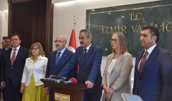 Milli Eğitim Bakanı Mahmut Özer, bir dizi program gerçekleştirmek amacıyla geldiği İzmir'de Vali Yavuz Selim Köşger'i makamında ziyaret etti. Valilik Şeref Defteri'ni imzalayan Bakan Özer, daha sonra Vali Köşger, İl Milli Eğitim Müdürü Murat Mücahit Yentur, AK Parti İzmir Milletvekili Ceyda Bölünmez Çankırı ve bakanlık bürokratlarının da yer aldığı toplantıya katıldı. Toplantı sonrası açıklama yapan Bakan Özer, "Yaklaşık 2,1 milyarlık yatırımı İzmir'e kazandırmıştık. Bugün İzmir'e 3 milyarlık ilave yatırım vererek, 2,1 milyarlık yatırımı 5,1 milyara çıkarmış oluyoruz. İnşallah inanıyorum ki İzmirimiz'de Sayın Valimizin koordinasyonunda yatırımlar hızlı bir şekilde gerçekleşecek. 2022 yılı bitmeden 5,1 milyarlık yatırımı daha yüksek rakamlara çıkarma imkanımız olacak. En önem verdiğimiz konulardan birisi güçlendirme. İzmir bu bağlamda en mağdur illerimizden biriydi. İzmir'deki güçlendirme çalışmaları devam ediyor. Mevcut yapıların güçlenmesiyle daha dayanıklı ve güvenli eğitim ortamının sağlanması bağlamında 2022 yılına gerçekten çok verimli başladık. İnşallah bugünden itibaren 6-7 ay içerisinde tüm mevcut güçlendirmeleri nihayete erdirmek istiyoruz" diye konuştu.