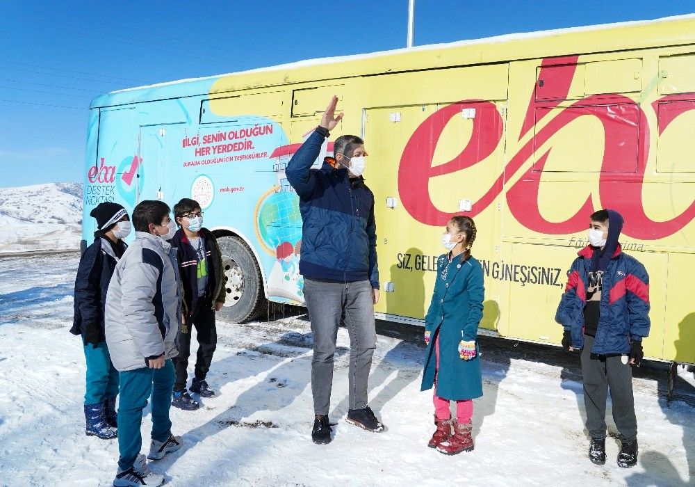 Milli Eğitim Bakanlığı, uzaktan eğitim sürecindeki öğrencilere alternatif destek sunmak üzere 14 bin 273 EBA Destek Noktası ve 164 EBA Mobil Destek aracı ile köylerden mezralara kadar uzanan geniş bir alanda saha çalışmalarını sürdürüyor. Milli Eğitim Bakanı Ziya Selçuk, Türkiye'nin dört bir yanını dolaşan EBA Mobil Destek araçlarından birinin yolculuğuna eşlik etti. Ankara'nın Kahramankazan ilçesi Yassıören köyünde Köy Konağı önünde öğrencileri ağırlayan EBA Mobil Destek aracındaki lise öğrencileriyle buluşan Selçuk, canlı derslere de katıldı. Bakan Selçuk, ders bitiminde öğrencilerle sohbet ederek küçük birer hediyeyle vedalaştıktan sonra mobil destek ekipleriyle 2 kilometre uzaklıktaki Soğulcak köyüne hareket etti. Araç, eski köy ilkokulunun bahçesine konuşlandı. Aracın misafirleri bu kez ilkokul ve ortaokul öğrencileri oldu. 6 öğrenci canlı derslerine Bakan Selçuk ile birlikte katıldı. Selçuk, çocukların öğretmenleri ve sınıf arkadaşlarıyla sohbet etti. Çocuklar uzaktan eğitimi, okullarına özlemlerini anlattı.