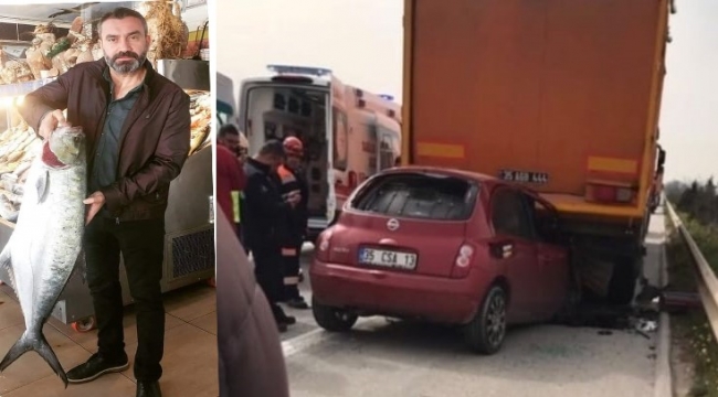 Kaza dün İzmir Çeşme Otoyolu'nda Güzelbahçe yol ayrımına gelmeden meydana geldi. Narlıdere Sahilevleri Taka Balıkevi sahibi Özcan Bakoğlu, yönetimindeki 35 CSA 13 plakalı otomobil ile otoyolda seyrederken, emniyet şeridinde park halinde duran İzmir Büyükşehir Belediyesi'ne ait resmi plakalı 35 AGB 444 çöp taşıma TIR'ına arkadan çarptı.