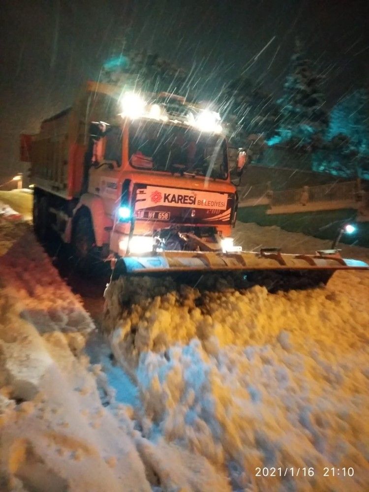 Balıkesir'de dün sabah saatlerinden bu yana etkisini sürdüren kar yağışı nedeniyle 200 kırsal mahalle yolu ulaşıma kapalı. Karayolları ve belediye ekiplerinin yol açma çalışmaları gece ve gündüz özverili olarak sürüyor.