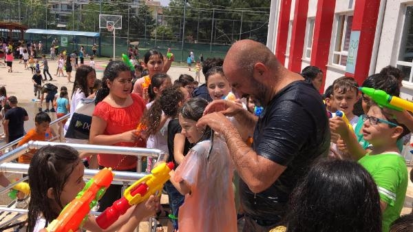 BALIKESİR Burhan Erdayı İlkokulu'nda yüzlerce öğrenci su tabancası, şişe ve kovalarla su savaşı yaparak, 2021-2022 eğitim öğretim yılını bitirdi.