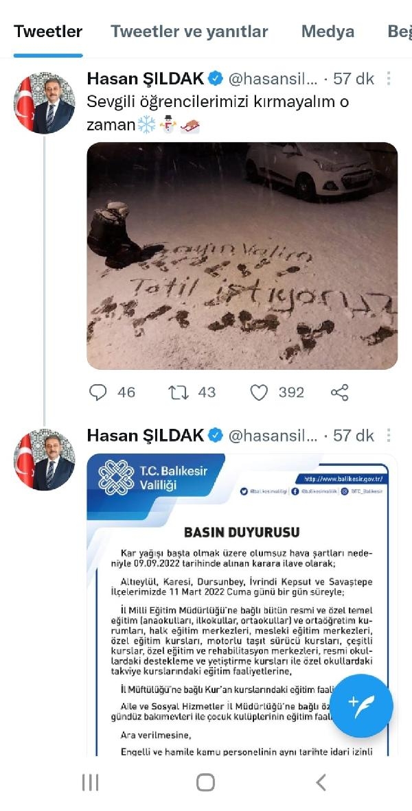 BALIKESİR'de öğrenciler, karlı zemine "Sayın Valim, tatil istiyoruz" yazıp fotoğrafı sosyal medyada paylaştı. Vali Hasan Şıldak da "Sevgili öğrencilerimizi kırmayalım o zaman" mesajıyla kar tatilini duyurdu.
