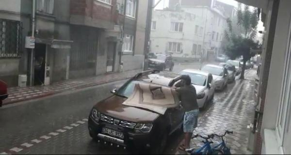 Meteoroloji tarafından bugün için dolu ve gök gürültülü sağanak yağış uyarısı yapılan Balıkesir ve çevre ilçelerinde saat 15.00 sıralarında sağanak yağış başladı. Dolu ile karışık yaklaşık 1 saat etkili olan sağanak nedeniyle cadde ve sokaklar yağmur sularıyla doldu. Su birikintileri nedeniyle sürücüler zor anlar yaşadı. Yağmuru cadde üzerinde yakalanan vatandaşlar ise korunmak için saçak altlarına sığındı.