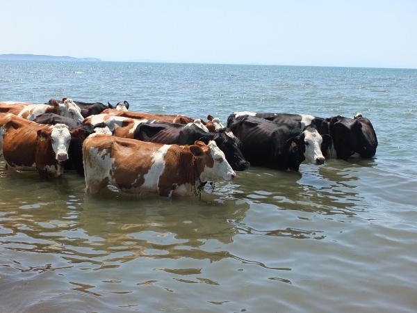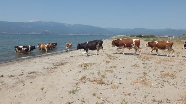 Burhaniye ilçesinde, son günlerde 40 dereceyi bulan sıcaklar vatandaşları bunaltırken, merada otlayan hayvanları da olumsuz etkiliyor. Orjan Tatil sitesi yakınında otlayan inekler de aşırı sıcaktan bunalıp, soluğu denizde alıyor. Orjan sahillerinde kardeşinin inek sürüsünü otlatan, 1 çocuk babası çoban Kadir Korkak (52), sıcak havadan hayvanları da etkilediğini söyledi. Sürüsündeki ineklerin günde iki kez denize girdiğini belirten Korkak, "Denize girmeyi alışkanlık haline getirdiler. 20 dakika kadar serinledikten sonra kendiliğinden sudan çıkıyorlar. Serinledikten sonra daha iyi otluyorlar. Denize girmeleri bu nedenle benim içinde iyi oluyor" dedi.