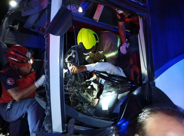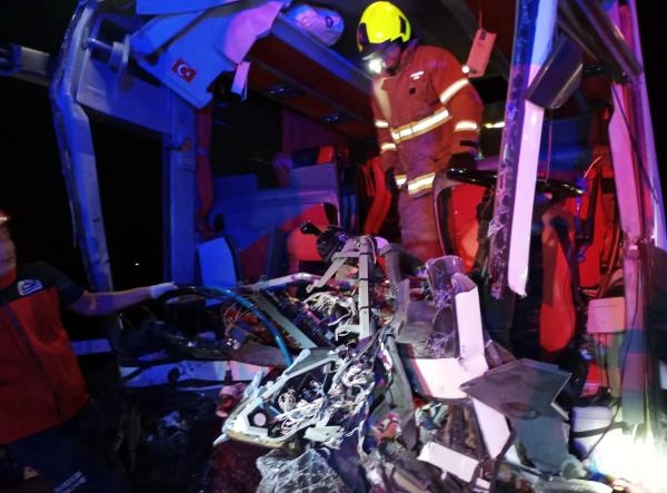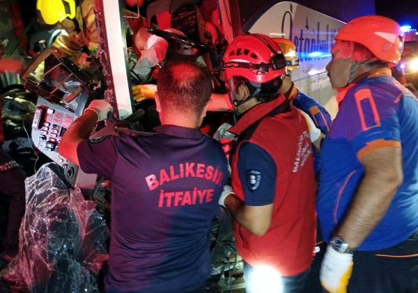 BALIKESİR'de yolcu otobüsünün aynı yöne giden beton mikserine çarptığı kazada, 2'si ağır, 44 kişi yaralandı.