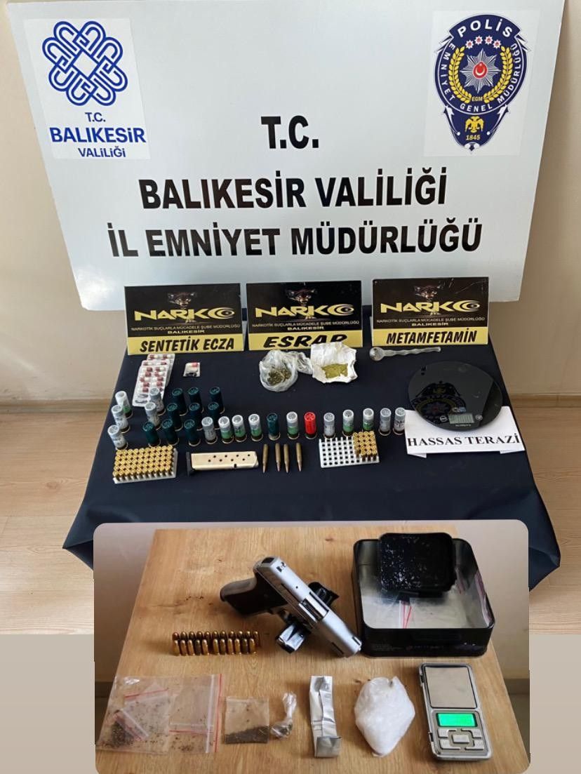 Yapılan operasyonda; 38,34 gram metamfetamin, 25 adet sentetik ecza hap, 10,76 gram esrar, 2 adet hassas terazi, 1 adet boş şarjör, 80 adet 9 mm fişek, 11 adet 34'lük av fişeği, 15 adet av fişeği, 4 adet uzun namlulu fişek, 1 adet uyuşturucu içiminde kullanılan aparat, 1 adet ruhsatsız 7x65 tabanca ele geçirildi.