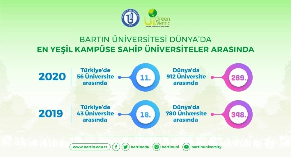 Sürdürülebilirlik ve çevre bilinci konusunda uluslararası bir platform olan Green Metric (Yeşil Ölçüm) Dünya Üniversiteler Sıralaması açıklandı. "Yeşil Üniversiteler 2020" sıralamasında Dünya genelinde 912 yükseköğretim kurumunun değerlendirildiği sıralamaya Türkiye'den 56 üniversite yer aldı. 'Sürdürülebilir Yeşil Kampüs' çalışmaları kapsamında birçok alanda önemli çalışmaların yapıldığı Bartın Üniversitesi, Türkiye'nin en iyi 11'inci yeşil kampüsü olurken Dünya'da ise 79 basamak birden yükselerek 269'uncu sıraya yerleşti. Bartın Üniversitesi, Green Metric'in geçtiğimiz yıl yaptığı "Yeşil Üniversiteler 2019" sıralamasında Türkiye'deki 43 üniversite arasından 16'ncı, Dünya'daki 780 üniversite arasından ise 348'inci sırada yer almıştı. Bartın Üniversitesi bir önceki yıla göre hem Dünya genelinde hem de Türkiye genelinde sıralamada yer verilen üniversite sayısı artmış olmasına rağmen sıralamadaki yerini yükseltmeyi başardı.