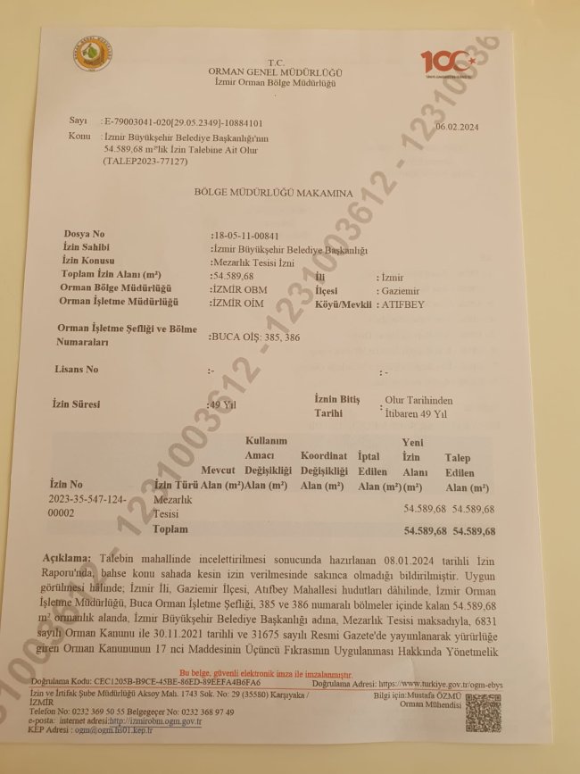 Dağ, Sarnıç’ta bulunan 55 dönümlük alanın İzmir Orman Bölge Müdürlüğü’nden İzmir Büyükşehir Belediyesi’ne tahsisini paylaştı.