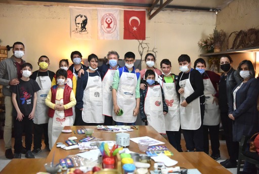 Atık Sanat Atölyesi'nde Başkan İduğ ile resim boyayan ve geri dönüştürülmüş parçalardan hediyelik eşya yapan otizmli çocuklar ve aileler keyifli saatler geçirdi.