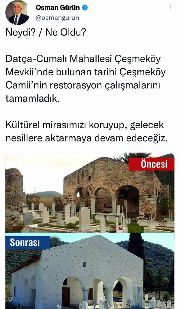 MUĞLA'nın Datça ilçesinin kırsal Cumalı Mahallesi'nde sıva üzerine kiremit parçaları yapıştırılan ve duvarları beyaza boyanan 2 asırlık cami restorasyonuyla ilgili tepkiler üzerine açıklama yapan Muğla Büyükşehir Belediye Başkanı Osman Gürün, caminin özgün dokusuna uygun restore edildiğini söyledi.