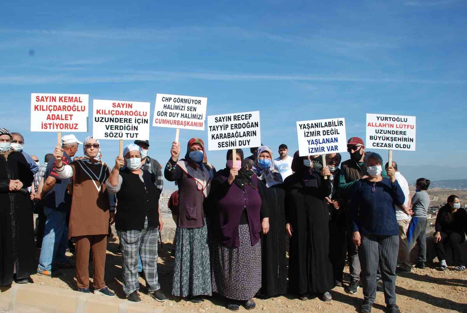 Mahalleliler adına açıklama yapan Eray Uslu, "Uzundere ve Yurtoğlu kentsel dönüşüm mağdurları olarak sesleniyoruz. Mahallelerimiz, 9 yıl önce kentsel dönüşüm kapsamında İzmir Büyükşehir Belediyesi tarafından tapular alınarak planlamaya sokuldu. Ancak 9 yıldır hak ettiğimiz evlerimize bir türlü geçemedik. Mağduriyetlerimizi çeşitli platformlarda sık sık İzmir Büyükşehir Belediyesi ve Karabağlar Belediyesi başta olmak üzere sık sık dile getirdik. Maalesef istediğimiz geri dönüşleri alamadık" diyerek 24 Ekim günü mahallede bir dizi açılış yapan CHP Genel Başkanı Kemal Kılıçdaroğlu'na mağduriyetlerini ilettiklerini hatırlattı. İzmir Büyükşehir Belediye Başkanı Tunç Soyer'in önümüzdeki dönemde ihaleye çıkılacağını ifade ettiğini söyleyen Uslu, "CHP Genel Başkanı Kemal Kılıçdaroğlu da 'Biz burayı yaparız' dedi. Ancak genel başkan nezdinde karşılık bulan mağduriyetimizin giderilmesi talebine karşılık İzmir Büyükşehir Belediye Başkanı Tunç Soyer, tam 45 gün sonra mahalle sakinlerine randevu vererek büyük bir hayal kırıklığına imza attı" dedi.