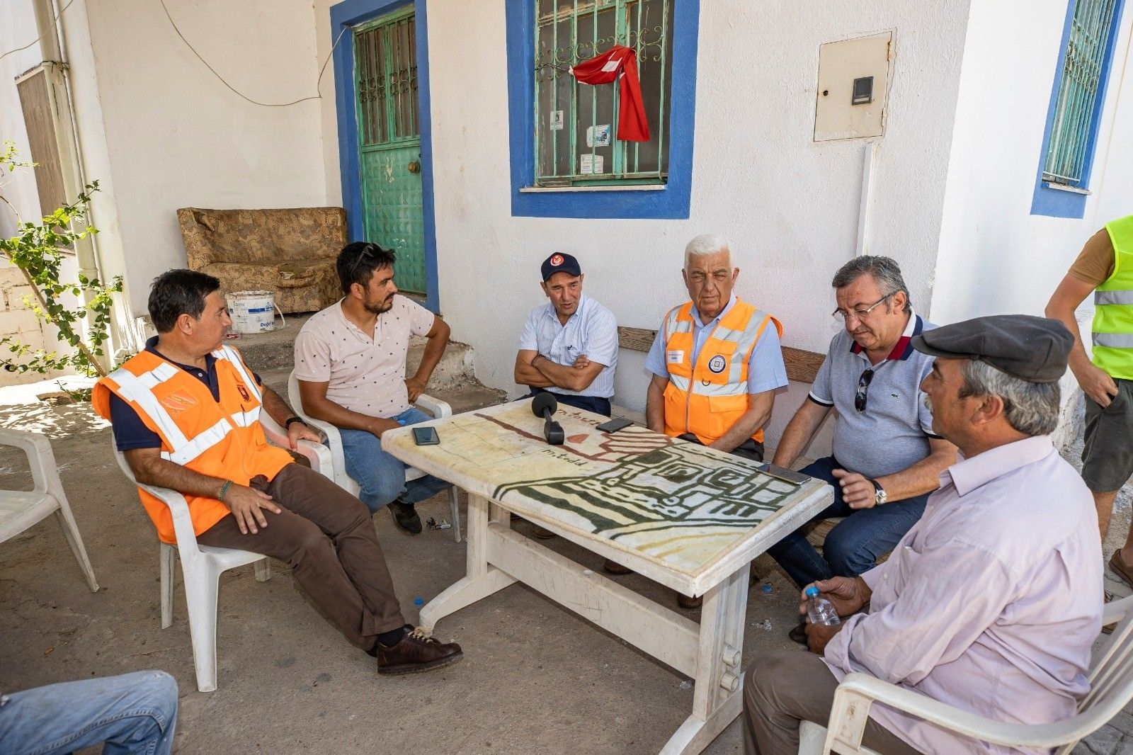 Heyet yangında zarar gören köylerde muhtarlarla bir araya geldi. Başkan Tunç Soyer, "Biz İzmir Büyükşehir Belediyesinin imkanlarını seferber etmeye hazırız. Hayvancılıksa hayvancılık, zeytincilikse zeytincilik, ürününü satın almaksa satın almak. Biz ne gerekiyorsa yapmaya hazırız. Tespitlerden sonra elimizden ne geliyorsa yapacağız. Evi tamir ettirebilirsin tamam ama tarımı nasıl sürdüreceksin? Parayı nerden kazanmaya devam edeceksin? Mesele orada. Burada biz varız. Biz bu felaketin sonuçlarını hafifletebilmek için, zararı azaltmak için ne gerekiyorsa yapacağız. Kalbimiz, aklımız sizinle" diye konuştu.