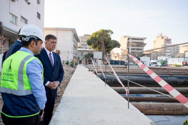 Ziyareti kapsamında ek hizmet binasının inşaat çalışmalarını yerinde inceleyen Başkan Tugay, burada da Yapı İşleri Dairesi Başkanı Onur Açık’tan son durum hakkında bilgi aldı.