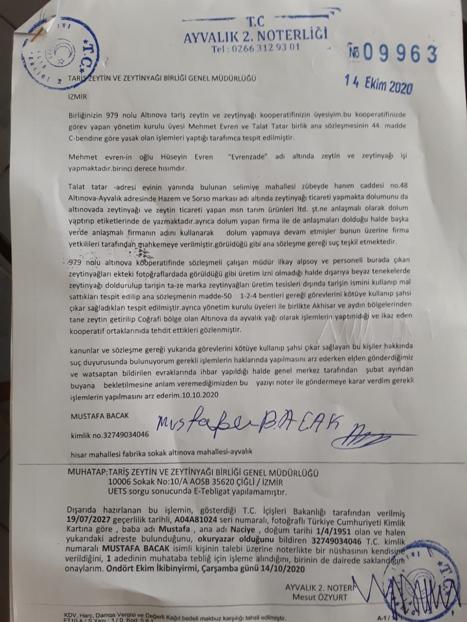 Kooperatif yönetiminde bulunanların yasak olmasına karşın zeytin-zeytinyağı sektöründe şirketleri bulunduğunu belirten Mustafa Bacak, “Ayrıca Aydın ve yöresinden getirilen tane zeytinler, coğrafi işareti bulunan Altınova’da Ayvalık yağı olarak işlemleri yaptırılmıştır. Bu konuda uyarıda bulunan kooperatif üyeleri tehdit edilmiştir” diye konuştu. Bacak’ın Tariş’e verdiği dilekçe şöyle: