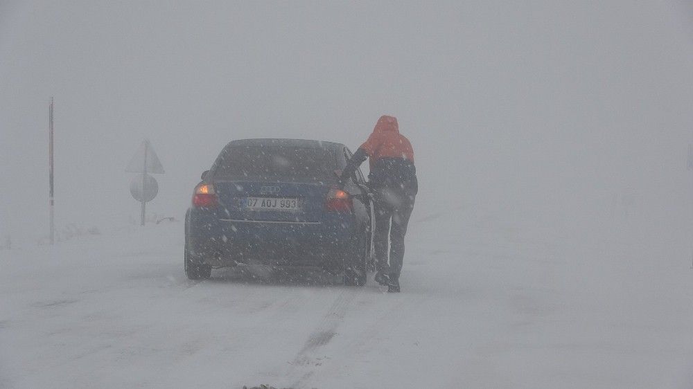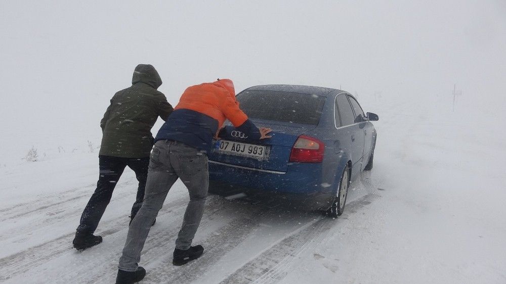 Karayolları ekiplerinin de karla mücadele çalışması yaptığı yolda, ilerlemekte güçlük çeken sürücüler birbirlerinin araçlarını iterek ilerleyebildi.