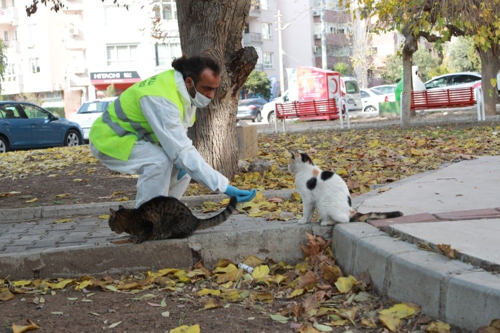 İzmir'de Bayraklı Belediyesi, sokağa çıkma kısıtlaması süresince sokak hayvanlarının aç kalmaması için kentin çeşitli noktalarına mama ve su bırakıyor