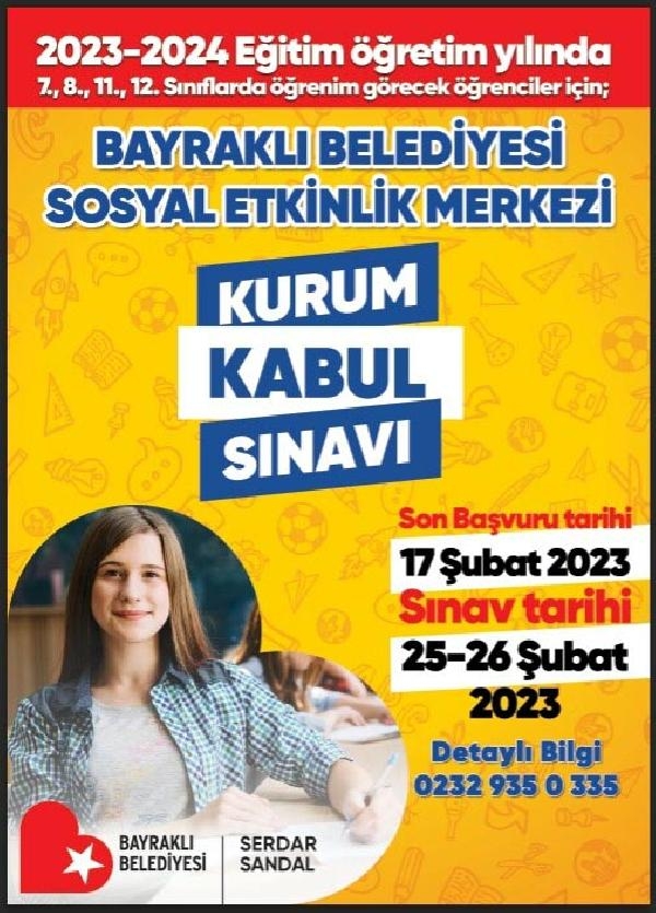 OKUL öncesi eğitim kurumlarıyla anaokulundan üniversite düzeyine kadar binlerce öğrenciye destek olan Bayraklı Belediyesi, Bayraklı Sosyal Etkinlik Merkezi için 2023-2024 eğitim-öğretim yılı kurum kabul sınavı yapacak. Başkan Serdar Sandal, "Eğitim, her zaman önceliğimiz olmaya devam edecek" dedi.