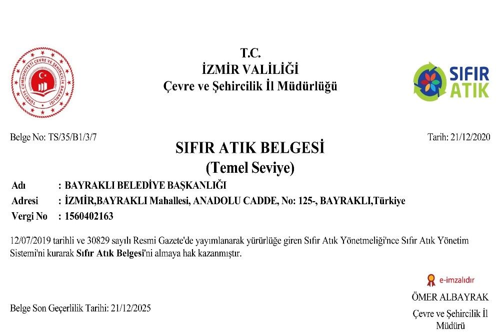Bayraklı Belediyesinde geçtiğimiz haftalarda hayata geçirilen sıfır atık yönetim sistemi, Çevre ve Şehircilik Bakanlığınca tescillendi. Bayraklı Belediye Başkanı Serdar Sandal'ın onayıyla başlayan uygulama kapsamında, Bayraklı Belediyesi hizmet binalarında masa altlarındaki çöp kutuları kaldırılıp atıklar, geri dönüşüm için koridorlara yerleştirilen kutularda ayrıştırılarak toplanmaya başlamıştı. Bunun üzerine çalışmalarını sürdüren Bayraklı Belediyesi Temizlik İşleri Müdürlüğünün uygulaması başarılı görülerek, "Sıfır Atık Belgesi" almaya layık görüldü. Belediye binalarındaki uygulamanın ilçe genelinde de yaygınlaştırılması ve geri dönüşüme önemli katkı sağlanması hedefleniyor.