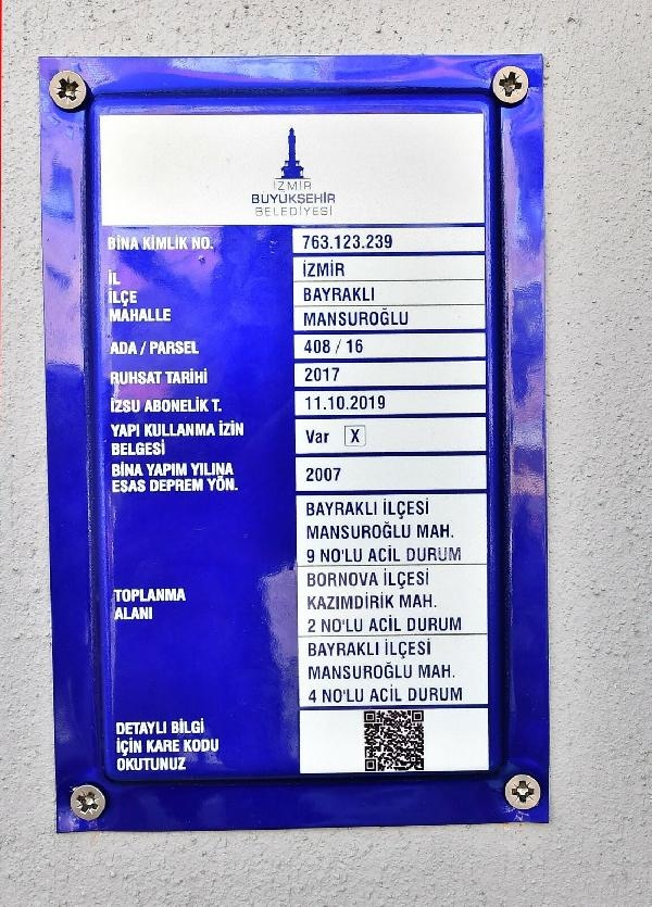 İzmir Büyükşehir Belediyesi Bayraklı ilçesinin mevcut yapı stoku envanterini çıkardı. Bu çalışmanın ardından 31 bin 146 yapımının kimlik belgesi hazırlandı. Bayraklı'daki yapıların bilgilerine artık İzmir Büyükşehir Belediyesi internet sitesi 'www.izmir.bel.tr', 'Bizİzmir' dijital platformu ve 'Bizİzmir' mobil uygulamasından ulaşılabileceği belirtildi. Bina kimlik belgesi pilot bölge olarak seçilen Mansuroğlu Mahallesi'nde binaların girişlerine asıldı. Üzerinde ada/parsel, ruhsat tarihi, yapı kullanım izin belgesi, toplanma alanları gibi bilgilerin yer aldığı kartlar üzerinde, kare kod uygulaması da bulunuyor. Yurttaşlar, kart üzerindeki karekodu telefondaki karekod uygulamasına okutarak binaya dair tüm bilgileri öğrenebiliyor.