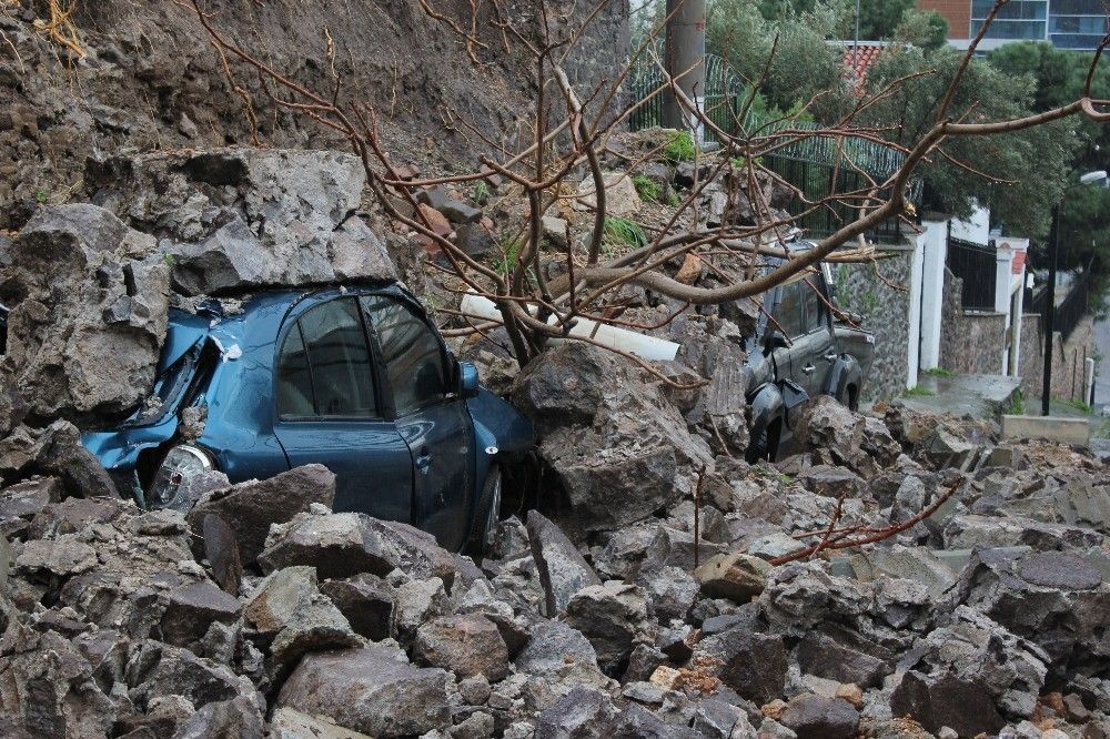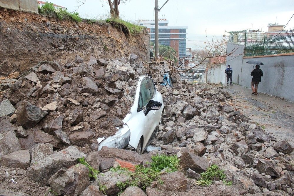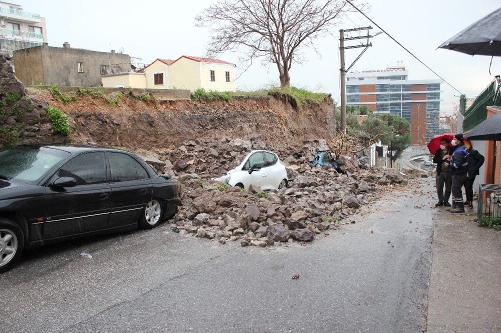İzmir'in Bayraklı ilçesinde sağanak yağış nedeniyle bir sokakta istinat duvarı çöktü. Çöken istinat duvarının altında kalan 4 araçta maddi hasar meydana geldi.