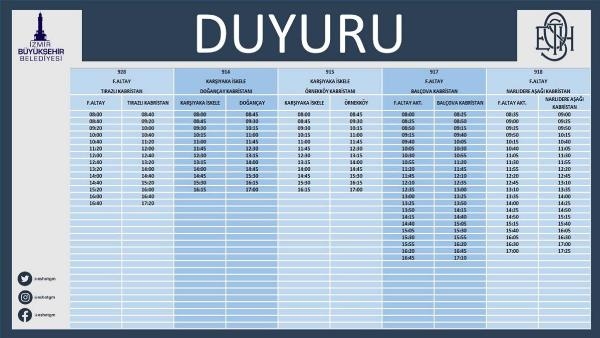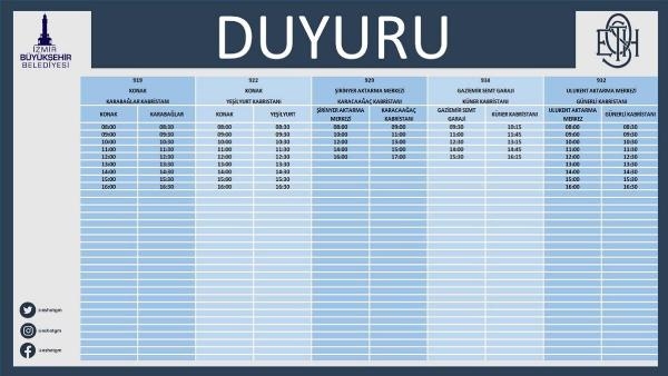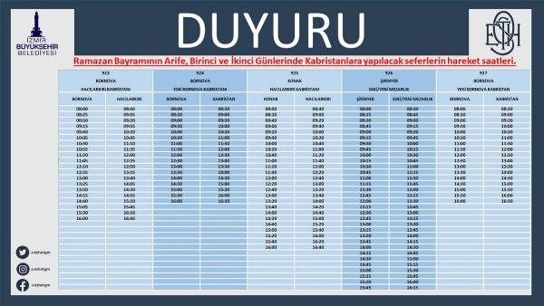 ESHOT otobüs seferleri, bayram süresince pazar günü çalışma programına göre yapılacak. Orman köyü hatları da çalışacak. ESHOT Genel Müdürlüğü, arife günü ile bayramın ilk iki günü mezarlıklara, özel seferler de yapacak. Önceki bayramlarda 12 olan mezarlık hatlarına, üç yeni hat daha eklendi. Programa ilişkin ayrıntılı bilgilere, 'www.eshot.gov.tr' internet adresinden ulaşılabilir.