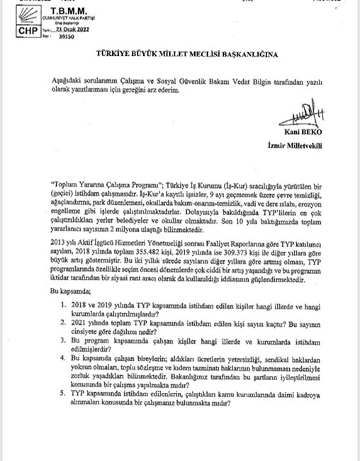 CHP Milletvekili Beko’nun yanıtlanmasını istediği sorular ise şöyle: 2018 ve 2019 yılında TYP kapsamında istihdam edilen kişiler hangi illerde ve hangi kurumlarda çalıştırılmışlardır? 2021 yılında toplam TYP kapsamında istihdam edilen kişi sayısı kaçtır? Bu sayının cinsiyete göre dağılımı nedir? Bu program kapsamında çalışan kişiler hangi illerde ve kurumlarda istihdam edilmişlerdir? Bu kapsamda çalışan bireylerin; aldıkları ücretlerin yetersizliği, sendikal haklardan yoksun olmaları, toplu sözleşme ve kıdem tazminatı haklarının bulunmaması nedeniyle zorluk yaşadıkları bilinmektedir. Bakanlığınız tarafından bu şartların iyileştirilmesi konusunda bir çalışma yapılmakta mıdır? TYP kapsamında istihdam edilenlerin, çalıştıkları kamu kurumlarında daimi kadroya alınmaları konusunda bir çalışmanız bulunmakta mıdır?