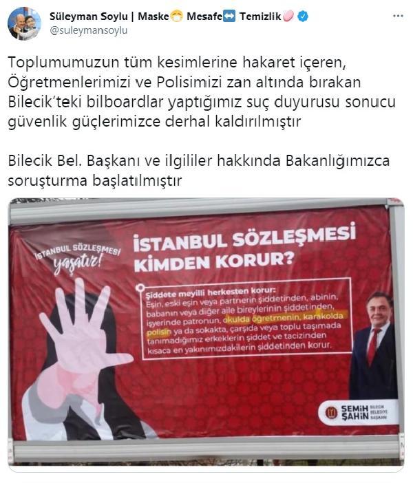 İçişleri Bakanı Süleyman Soylu, Bilecik'teki billboardların yapılan suç duyurusu sonucu kaldırıldığını ve Belediye Başkanı Semih Şahin ve ilgililer hakkında soruşturma başlatıldığını duyurdu.