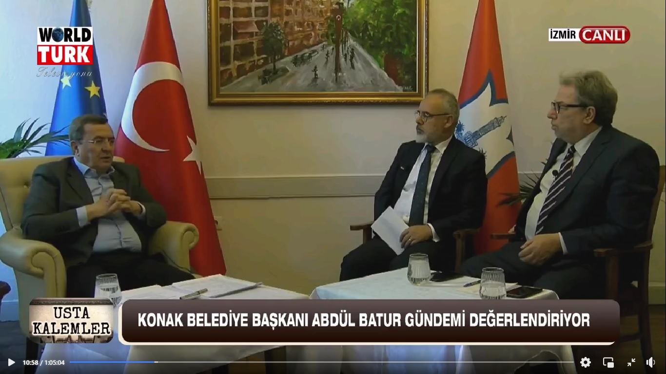 World Türk TV'de Hasan Çölmekçi'nin hazırlayıp Manşet Türkiye Haber Müdürü Erhan Hartaç'la sunduğu 'Usta Kalemler' programının canlı yayın konuğu İzmir'in Konak ilçesi Belediye Başkanı Abdül Batur oldu. Programda gündemi değerlendiren Belediye Başkanı Abdül Batur, Cumhuriyet tarihinin en büyük felaketi olan ve 10 şehirde büyük yıkıma, can kaybına neden olan depreme dikkat çekerek, bölgeye yardım malzemeleri ile 60 kişilik kurtarma ekibi gönderdiklerini söyledi.