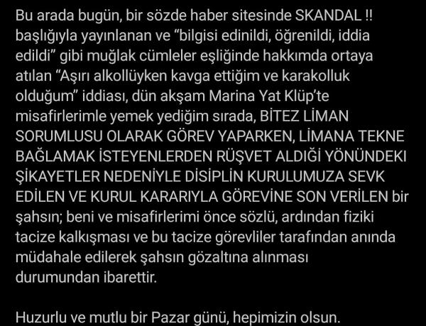 Gece yaşanan olayla ilgili sosyal medya hesabından açıklama yapan Başkan Aras, "Bu arada bugün, bir haber sitesinde 'skandal' başlığıyla yayınlanan ve 'bilgisi edinildi, öğrenildi, iddia edildi' gibi muğlak cümleler eşliğinde hakkımda ortaya atılan 'Aşırı alkollüyken kavga ettiğim ve karakolluk olduğum' iddiası, dün akşam Marina Yacht Klüp'te misafirlerimle yemek yediğim sırada, Bitez Liman sorumlusu olarak görev yaparken, limana tekne bağlamak isteyenlerden rüşvet aldığı yönündeki şikayetler nedeniyle disiplin kurulumuza sevk edilen ve kurul kararıyla görevine son verilen bir şahsın; beni ve misafirlerimi önce sözlü, ardından fiziki tacize kalkışması ve bu tacize görevliler tarafından anında müdahale edilerek şahsın gözaltına alınması durumundan ibarettir" ifadelerini kullandı.