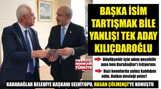 İzmir’in Karabağlar ilçesinde belediye başkanlığında 8. yılını dolduran Muhittin Selvitopu, Manşet Türkiye Genel Yayın Yönetmeni Hasan Çölmekçi’nin sorularını cevapladı. Cumhurbaşkanlığı adaylığının, belediye başkanlarının değil Kılıçdaroğlu'nun hakkı olduğunu söyledi.