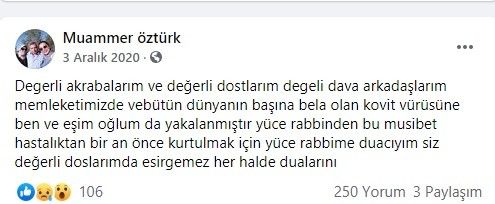 İYİ Partili Muammer Öztürk, bundan bir ay önce sosyal medya hesabından paylaşım yaparak kendisi eşi ve oğlunun Korona virüse yakalandığını duyurmuştu. Öztürk'ten geriye, "Değerli akrabalarım, değerli dostlarım ve değerli dava arkadaşlarım. Memleketimizde ve bütün dünyanın başına bela olan Covid-19 virüsüne ben, eşim ve oğlum da yakalanmıştır. Yüce Rabbimden bu musibet hastalıktan bir an önce kurtulmak için Yüce Rabbime duacıyım. Siz değerli dostlarım da esirgemez herhalde dualarını" ifadelerini yer verdiği paylaşımı kaldı.
