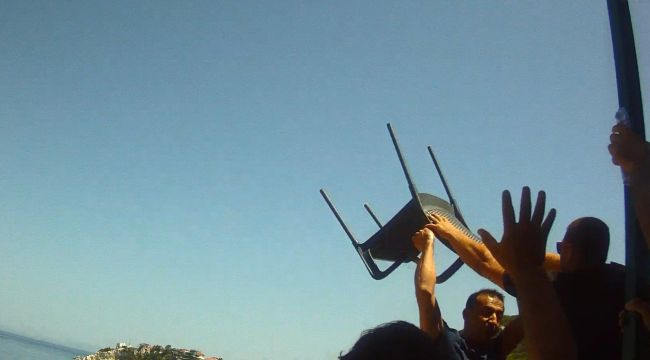 İzmir'in Karaburun ilçesinde, iddialara göre mülkiyeti belediyeye ait olan arsayı izinsiz kullanan bir mekana giden görevliler, demir sopalı, şişeli, sandalyeli saldırıya uğradı. Darp raporu alan belediye personelleri şikayetçi olurken, saldırı anları yaka kamerasına yansıdı.