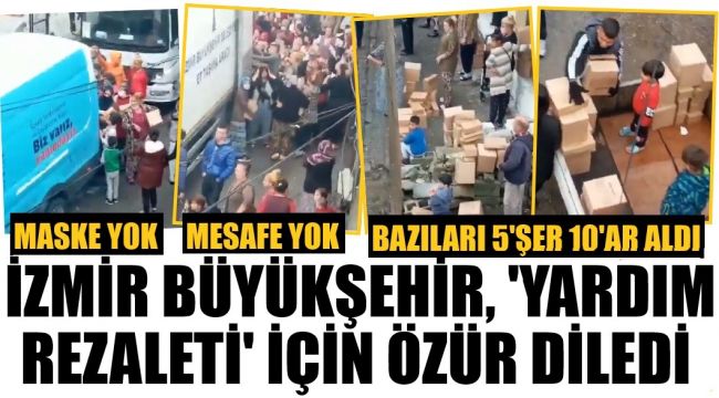 "İzmir Büyükşehir Belediyesi sosyal yardım ekiplerinin bir mahallemizdeki ihtiyaç sahibi ailelere erzak dağıtımı sırasında ortaya çıkan görüntüler nedeniyle son derece üzgünüz… Tüm kamuoyuna ve öncelikle de yaşanan izdiham nedeniyle yardıma ulaşamayan gerçek ihtiyaç sahiplerine bir özür borcumuz olduğunun da farkındayız.