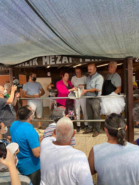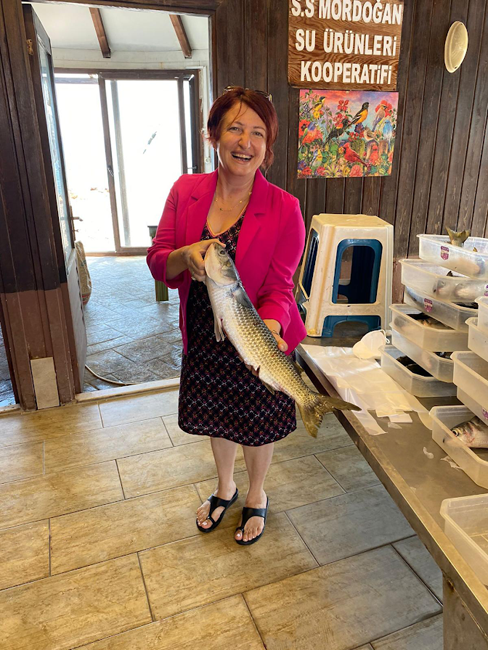 Tamamıyla Karaburun’a özgü olan ve Ağustos- Ekim arasında en verimli zamanını yaşayan topan kefal ile kameralara poz veren İlkay Girgin Erdoğan, tüm vatandaşları sağlık açısından balık tüketmeleri için Karaburun’a davet etti.