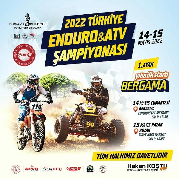 Türkiye Enduro ve ATV Şampiyonası ilk ayak yarışları, UNESCO mirası tarih ve turizm kenti Bergama'da yapılacak. Yarışlar, 14 Mayıs'ta saat 12.00'de Bergama Cumhuriyet Meydanı'ndaki magazin startı ile başlayacak. Aynı gün sporcular, Kozak Yaylası'nda oluşturulan Ekstrem Test Parkuru'nu geçecek. Şampiyonada 15 Mayıs'ta saat 11.00'de başlayacak olan yarış, 16.30'daki kupa töreniyle son bulacak. Kozak Enduro Parkuru'ndaki yarışlar; EnduroGP, E1, E2, E3, EB, EC, Gençler, Kadınlar ve Veteranlar kategorisinde, ATV branşında ise ATVGP, S1, S2 ve İki Çeker sınıflarında yapılacak.