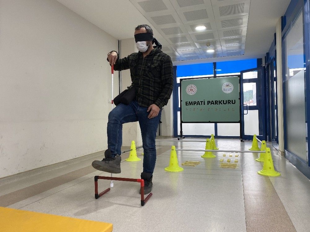 Düzce'de görme engellilerin yaşadığı sıkıntılara dikkat çekmek ve toplumda farkındalık oluşturmak için Düzce Gençlik ve Spor İl Müdürlüğü tarafından 'Empati Parkuru' kuruldu. Parkuru kullanan genç katılımcılardan kimisi yürümekte zorluk çekerken kimisi de yere düştü.