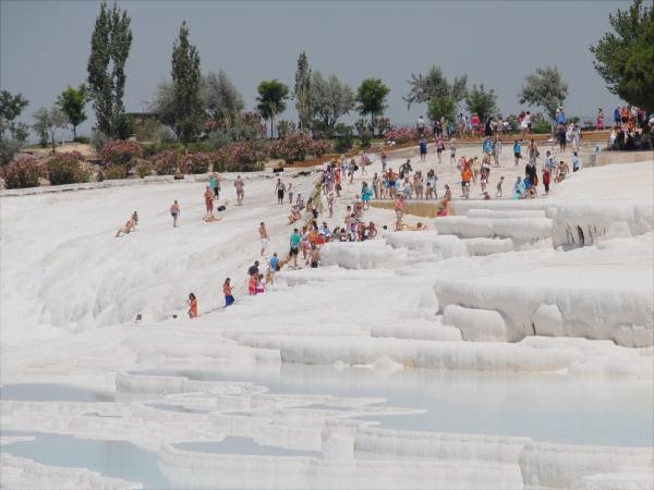 Beyaz renkli travertenleriyle dünyaca ünlü Pamukkale, pandemi nedeniyle kötü geçirdiği yılların ardından bu yıl yerli ve yabancı turistlerin akınına uğruyor. Dünyaca ünlü Pamukkale'yi geçen yılın ilk 5 ayında 127 bin 870 kişi ziyaret etti. Bu yılın aynı döneminde ise bu rakam 431 bin 83'e yükseldi. Geçen yıl mayıs ayında 38 bin 378 turistin ziyaret ettiği Pamukkale'yi bu yıl mayıs ayında ise 190 bin 200 turist ziyaret etti. Doğal güzelliği ve tarihi dokusuyla yılın her mevsiminde ziyaretçilerini ağırlayan Pamukkale'de geçen yıla oranla artan ziyaretçi sayısı turizmcileri sevindirdi.