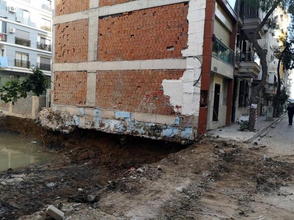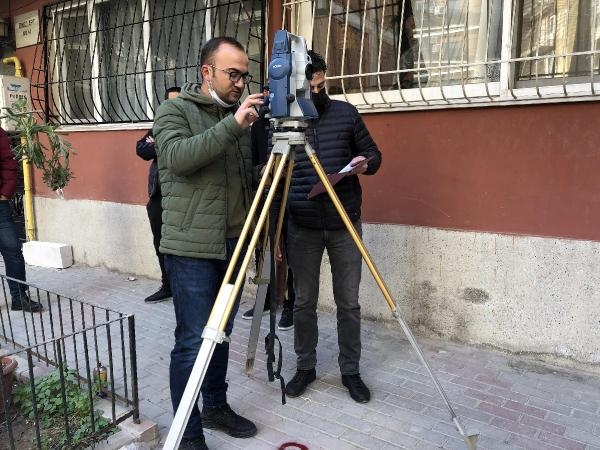 İZMİR'ide temel kazısı sırasında yan binada kayma meydana geldiği iddiası üzerine belediye ekipleri, yeniden ölçüm çalışmalarına başladı.