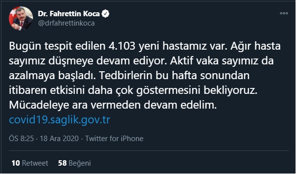 Fahrettin Koca, Twitter hesabından yaptığı açıklamada "Bugün tespit edilen 4.103 yeni hastamız var. Ağır hasta sayımız düşmeye devam ediyor. Aktif vaka sayımız da azalmaya başladı. Tedbirlerin bu hafta sonundan itibaren etkisini daha çok göstermesini bekliyoruz. Mücadeleye ara vermeden devam edelim" dedi.