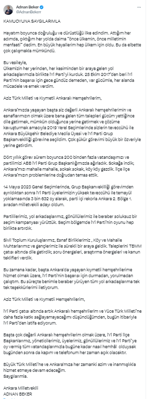 Çalışma arkadaşlarına teşekkür ederek sosyal medya hesabından açıklama yayınlayan Beker, "Hayatım boyunca doğruluğu ve dürüstlüğü ilke edindim. Attığım her adımda, çıktığım her yolda daima 'önce ülkemin, önce milletimin menfaati' dedim. En büyük hayallerim hep ülkem için oldu. Bu da elbette çok çalışmakla mümkündü. Bu vesileyle, Ülkemizin her yerinden, her kesiminden bir araya gelen yol arkadaşlarımızla birlikte İYİ Parti'yi kurduk. 25 Ekim 2017’den beri İYİ Parti'nin başarısı için gece gündüz demeden, var gücümle, her alanda mücadele ve emek verdim. Aziz Türk Milleti ve Kıymetli Ankaralı Hemşehrilerim, Ankara’mızda yaşayan başta siz değerli Ankaralı hemşehrilerimin ve esnaflarımızın olmak üzere bana gelen tüm talepleri gücüm yettiğince dile getirmek, mümkün olduğunca yerine getirmek ve çözüme kavuşturmak amacıyla 2019 Yerel Seçimlerinde sizlerin teveccühü ile Ankara Büyükşehir Belediye Meclis Üyesi ve İYİ Parti Grup Başkanvekilliği görevine seçildim. Çok şükür görevimi büyük bir özveriyle yerine getirdim. Dört yıllık görev sürem boyunca 200 binden fazla vatandaşımızı ve partilimizi ABB İYİ Parti Grup Başkanlığımızda ağırladık. Sokağa indik; Ankara’mızı mahalle mahalle, sokak sokak, köy köy gezdik. İlçe ilçe Ankara’mızın problemlerine doğrudan temas ettik. 14 Mayıs 2023 Genel Seçimlerinde, Grup Başkanvekilliği görevimden ayrıldıktan sonra İYİ Parti üyelerimizin yüksek teveccühü ile temayül yoklamasında 3 bin 632 oy alarak, parti içi rekorla Ankara 2. Bölge 1. sıradan milletvekili adayı oldum. Partililerimiz, yol arkadaşlarımız, gönüllülerimiz ile beraber soluksuz bir seçim kampanyası yürüttük. Seçim bölgemde İYİ Parti’nin oyunu hep birlikte artırdık. Sivil Toplum Kuruluşlarımız, Esnaf Birliklerimiz , Köy ve Mahalle Muhtarlarımız ve gençlerimiz ile sürekli bir araya geldik. Taleplerini TBMM çatısı altında dile getirdik; soru önergeleri, araştırma önergeleri ve kanun teklifleri verdik. Bu zamana kadar, başta Ankara'da yaşayan kıymetli hemşehrilerime hizmet olmak üzere, İYİ Parti'nin başarısı için durmadan, yorulmadan çalıştım. Bu süreçte benimle beraber yürüyen tüm yol arkadaşlarıma tek tek teşekkürlerimi iletiyorum. Aziz Türk Milleti ve Kıymetli Hemşehrilerim, İYİ Parti çatısı altında artık Ankaralı hemşehrilerim ve Yüce Türk Milleti’ne daha fazla katkı sağlayamayacağımı düşündüğümden, bugün itibariyle İYİ Parti’den istifa ediyorum. Başta çok değerli Ankaralı hemşehrilerim olmak üzere, İYİ Parti İlçe Başkanlarımız, yöneticilerimiz, üyelerimiz, gönüllülerimiz ve İYİ Parti’ye oy vermiş tüm vatandaşlarımızla bugüne kadar nasıl hemhâl olduysak bugünden sonra da kapım ve telefonum her zaman açık olacaktır. Büyük Türk Milleti’ne ve Ankara'mıza her zamanki azim ve inanmışlıkla hizmet etmeye devam edeceğim" ifadelerini kullandı.