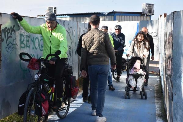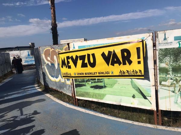 İZMİR'deki bisiklet severler, yağmur suyu bertaraf etme çalışması nedeniyle çevrilen alanda geçiş için bırakılan yolu yayalarla birlikte kullandıklarını belirtip, bu durumun tehlike oluşturduğu gerekçesiyle eylem yaptı.