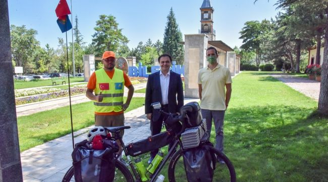 Bilecik Belediyesi Bisiklet Antrenörü Hakan Yavuz, Kazakistanlı bisikletliye rehberlik ederek, Bilecik'in tarihi ve kültürel değerleri hakkında bilgiler verdi.