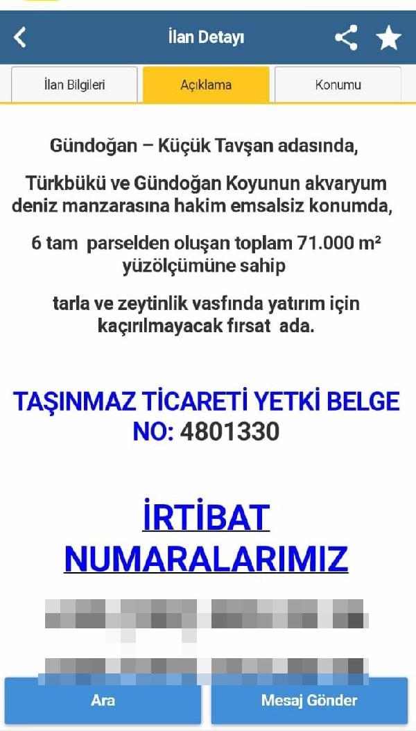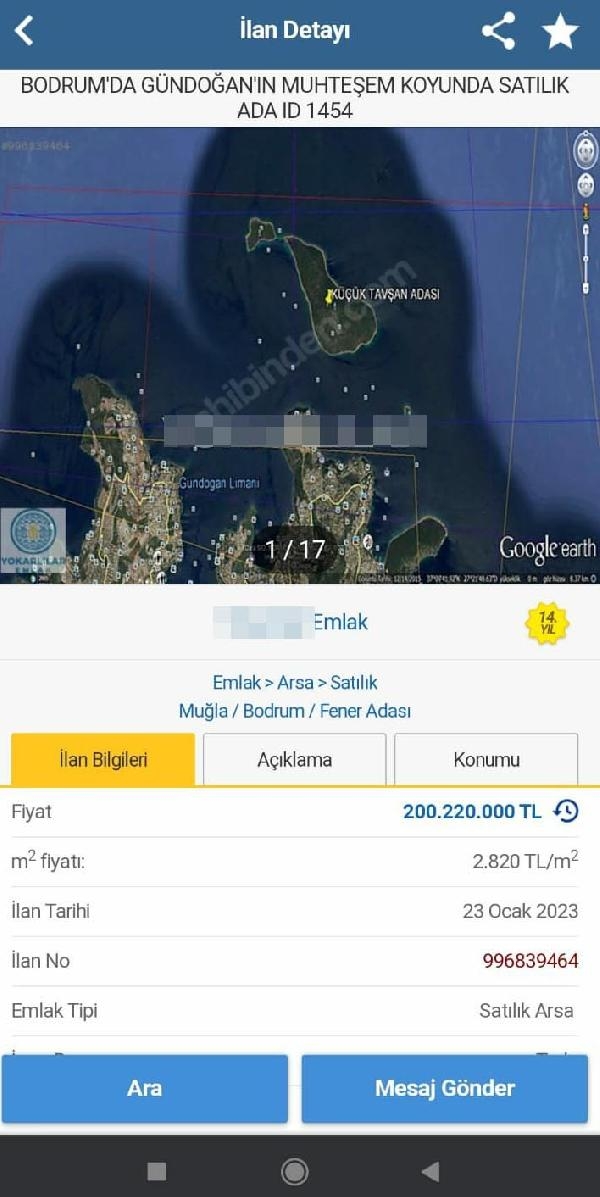 İlanda 220 milyon 220 bin liradan satışa çıkarılan adanın 6 parselden oluştuğu ve 71 bin metrekare yüz ölçümüne sahip olduğu belirtildi. Adanın tarla ve zeytinlik için yatırım amaçlı kullanılabileceği belirtildi. 23 Ocak'ta ilan çıkarılan adaya talebin olduğu, hisseli tapu olan adanın imar durumunun ise tarla olarak geçtiği bildirildi. (DHA)