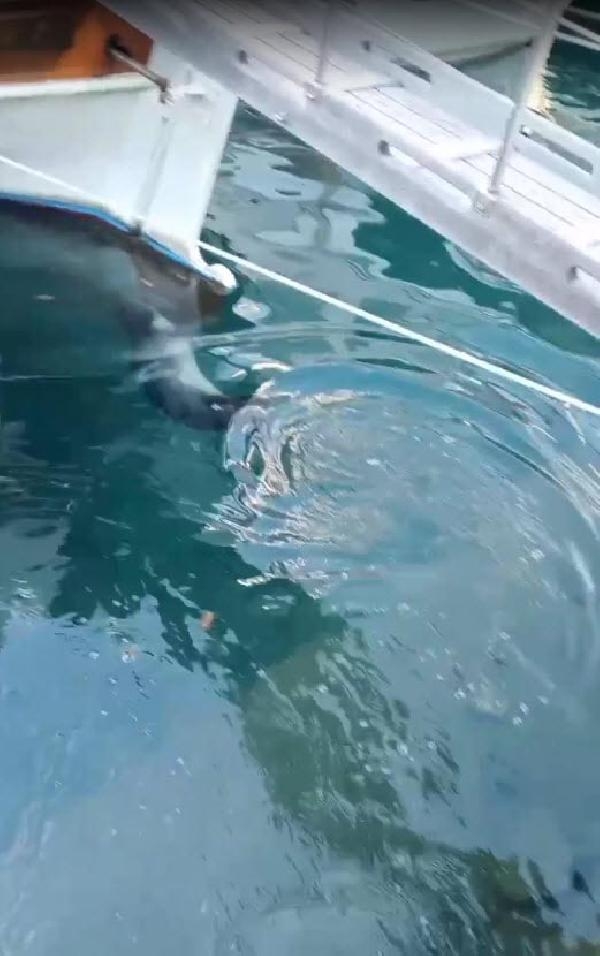 MUĞLA'nın Bodrum ilçesinde, nesli tükenme tehlikesi altında olan türlerden Akdeniz foku, limanda balık avlarken, balıkçılar tarafından görüntülendi.