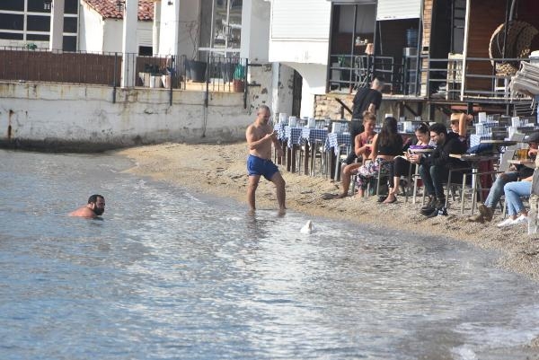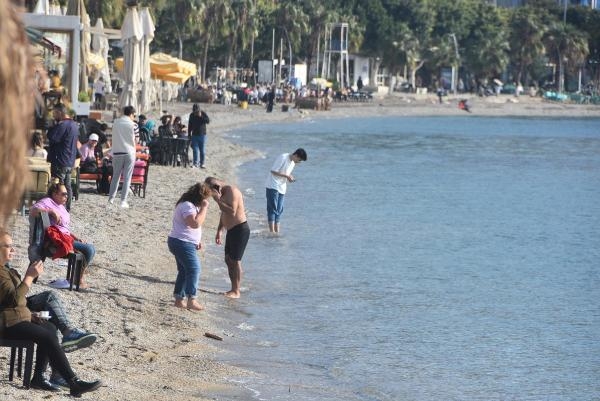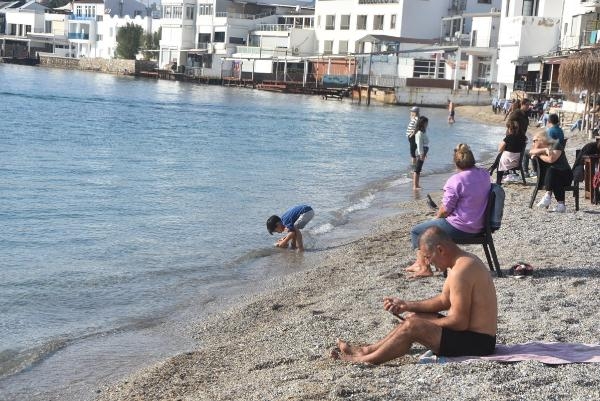 MUĞLA'nın Bodrum ilçesinde, sıcak havada yerli ve yabancı turistlerin bazıları denize girdi, bazıları da plajda güneşlendi.
