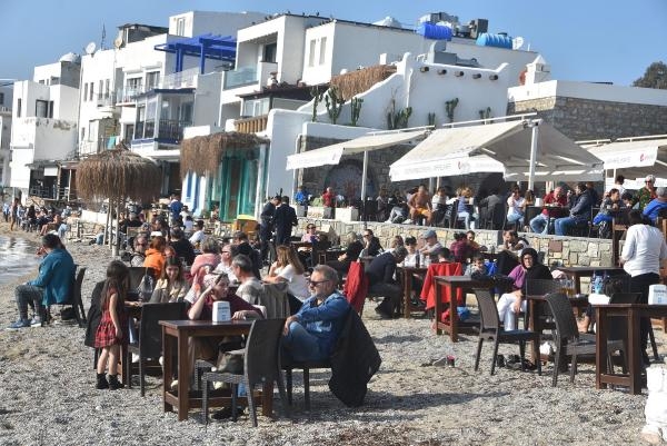 Dünyanın en önemli turizm merkezlerinden biri olan Bodrum'da 21 dereceyi bulan güzel havayla 19 derecelik deniz suyu sıcaklığını fırsat bilen yerli ve yabancı turistler, Kumbahçe başta olmak üzere Bitez ve Gümbet gibi noktalarda denize girdi. Bazı yabancı turistler ise plajda ve kumsalda oturup, vakit geçirmeyi tercih etti. (DHA)