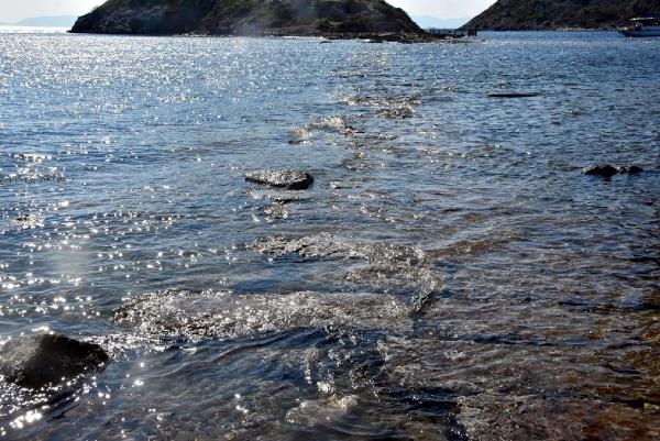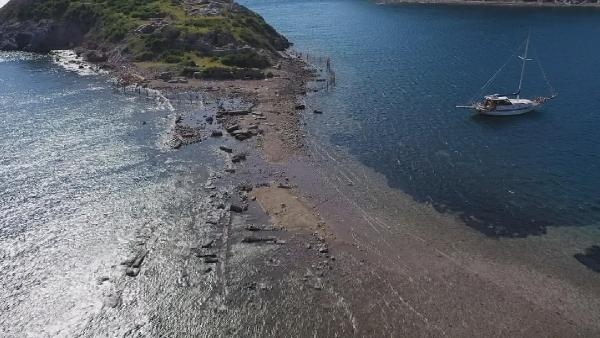 Gümüşlük Mahallesi'nde bulunan ve Tavşan Adası'na kadar uzanan tarihi Kral Yolu, denizin çekilmesiyle yeniden ortaya çıktı. Yılın bu zamanlarında gün yüzüne çıkan ve 3 bin 500 yıllık Myndos kentine giden Kral Yolu, dronla da havadan görüntülendi. Çekilmenin 15 gün sürdüğünü anlatan işletmeci Tuncay Yıldızili, "Yılın belli zamanlarında kuzeyden esen rüzgarlar denizleri açıyor. Deniz çekilince adaya kadar yürümek mümkün oluyor. Adaya çıkabiliyorsunuz, adada çok eski tarihi yapılar var. Burası sit alanı olduğu için kapatıldı. Belli zamanlar insanlar adaya çıkıp gezebiliyor. Bu yol 15 gün açık kalıp, sonra yeniden deniz sularının altında kalıyor" diye konuştu.